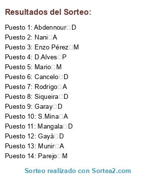 Lista de participantes: Abdennour D, Cancelo D, D.Alves P, Enzo Pérez M, Garay D, Gayà D, Mangala D, Mario M, Munir A, Nani A, Parejo M, Rodrigo A, S.Mina A, Siqueira D.