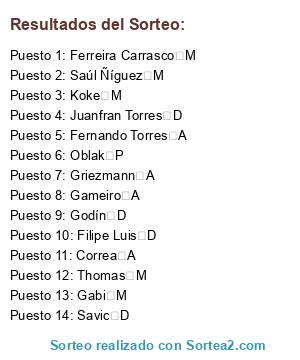 Lista de participantes: Correa A, Fernando Torres A, Ferreira Carrasco M, Filipe Luis D, Gabi M, Gameiro A, Godín D, Griezmann A, Juanfran Torres D, Koke M, Oblak P, Saúl Ñíguez M, Savic D, Thomas M.