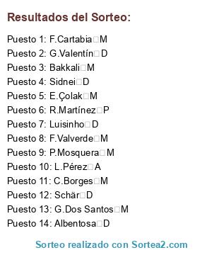 Lista de participantes: Albentosa D, Bakkali M, C.Borges M, E.Çolak M, F.Cartabia M, F.Valverde M, G.Valentín D, G.Dos Santos M, L.Pérez A, Luisinho D, P.Mosquera M, R.Martínez P, Schär D, Sidnei D.