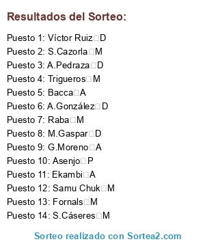 Lista de participantes: A.González D, A.Pedraza D, Asenjo P, Bacca A, Ekambi A, Fornals M, G.Moreno A, M.Gaspar D, Raba M, S.Cáseres M, S.Cazorla M, Samu Chuk M, Trigueros M, Víctor Ruiz D.