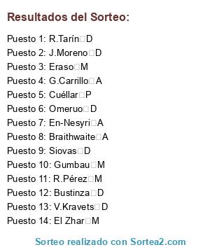 Lista de participantes: Braithwaite A, Bustinza D, Cuéllar P, El Zhar M, En-Nesyri A, Eraso M, G.Carrillo A, Gumbau M, J.Moreno D, Omeruo D, R.Pérez M, R.Tarín D, Siovas D, V.Kravets D.