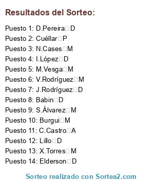 Lista de participantes: Babin D, Burgui M, C.Castro A, Cuéllar P, D.Pereira D, Elderson D, I.López D, J.Rodríguez D, Lillo D, M.Vesga M, N.Cases M, S.Álvarez M, V.Rodríguez M, X.Torres M.