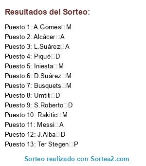 Lista de participantes: A.Gomes M, Alcácer A, Busquets M, D.Suárez M, Iniesta M, J.Alba D, L.Suárez A, Messi A, Piqué D, Rakitic M, S.Roberto D, Ter Stegen P, Umtiti D.