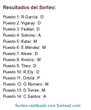 Lista de participantes: Alexis D, C.Santos A, D.Torres M, E.Méndez M, Feddal D, Katai M, Krsticic M, Ó.Romero M, Ortolá P, R.Ely D, R.García D, Sobrino A, Theo D, Vigaray D.