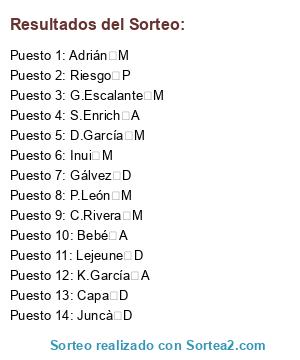 Lista de participantes: Adrián M, Bebé A, C.Rivera M, Capa D, D.García M, G.Escalante M, Gálvez D, Inui M, Juncà D, K.García A, Lejeune D, P.León M, Riesgo P, S.Enrich A.