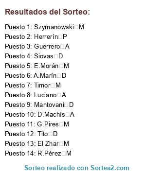 Lista de participantes: A.Marín D, D.Machís A, E.Morán M, El Zhar M, G.Pires M, Guerrero A, Herrerín P, Luciano A, Mantovani D, R.Pérez M, Siovas D, Szymanowski M, Timor M, Tito D.