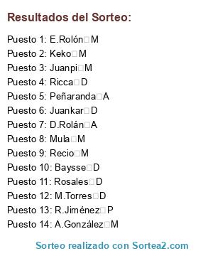 Lista de participantes: A.González M, Baysse D, D.Rolán A, E.Rolón M, Juankar D, Juanpi M, Keko M, M.Torres D, Mula M, Peñaranda A, R.Jiménez P, Recio M, Ricca D, Rosales D.