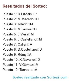 Lista de participantes: Calleri A, D.Castellano D, J.Castellano M, J.Viera M, M.Lemos D, M.Macedo D, R.Lizoain P, Rémy A, Tannane A, Toledo M, V.Gómez M, X.Navarro D.