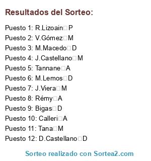 Lista de participantes: Bigas D, Calleri A, D.Castellano D, J.Castellano M, J.Viera M, M.Lemos D, M.Macedo D, R.Lizoain P, Rémy A, Tana M, Tannane A, V.Gómez M.