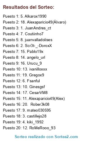 Lista de participantes: 1. JuanAndres_ct, 2. Scr3t-_-DoroxX, 3. castillejo28, 4. kiki_1992, 5. Alkarox1990, 6. Fsanful, 7. Coutiinho7, 8. juanvalladolises, 9. mateo030595, 10. Ginesgsf, 11. Alexaparicio49(Alex), 12. RoMeRooo_93, 13. ivanilloxxx, 14. angelo_url, 15. Pablo19x, 16. Urucu_9, 17. CesarVM8, 18. Alexaparicio49(Álvaro), 19. Gregox9, 20. Rober3k08.