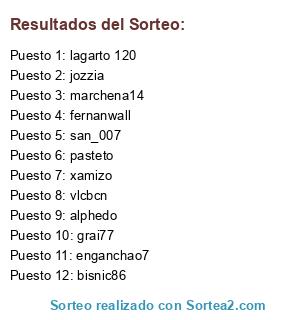 Lista de participantes: lagarto 120, fernanwall, grai77, san_007, enganchao7, xamizo, alphedo, bisnic86, jozzia, marchena14, pasteto, vlcbcn.