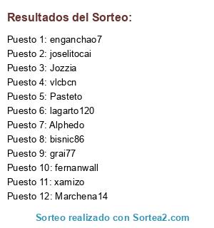 Lista de participantes: lagarto120, enganchao7, xamizo, Alphedo, bisnic86, Jozzia, Marchena14, Pasteto, vlcbcn, fernanwall, grai77, joselitocai.