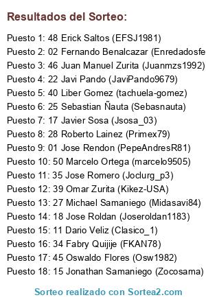 Lista de participantes: 01 Jose Rendon (PepeAndresR81), 02 Fernando Benalcazar (Enredadosfer), 15 Jonathan Samaniego (Zocosama), 17 Javier Sosa (Jsosa_03), 11 Dario Veliz (Clasico_1), 18 Jose Roldan (Joseroldan1183), 22 Javi Pando (JaviPando9679), 25 Sebastian Ñauta (Sebasnauta), 27 Michael Samaniego (Midasavi84), 28 Roberto Lainez (Primex79), 34 Fabry Quijije (FKAN78), 39 Omar Zurita (Kikez-USA), 40 Liber Gomez (tachuela-gomez), 35 Jose Romero (Joclurg_p3), 50 Marcelo Ortega (marcelo9505), 45 Oswaldo Flores (Osw1982), 46 Juan Manuel Zurita (Juanmzs1992), 48 Erick Saltos (EFSJ1981).