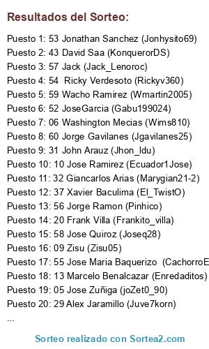 Lista de participantes: 05 Jose Zuñiga (joZet0_90), 06 Washington Mecias (Wims810), 08 Julio Franco (jcfrancomogro), 09 Zisu (Zisu05), 10 Jose Ramirez (Ecuador1Jose), 13 Marcelo Benalcazar (Enredaditos), 20 Frank Villa (Frankito_villa), 23 Nacho Gallegos (Nachogallegos), 29 Alex Jaramillo (Juve7korn), 31 John Arauz (Jhon_ldu), 37 Xavier Baculima (El_TwistO), 38 Fernando Zambrano (Fezf18), 43 David Saa (KonquerorDS), 51 Lucho Miguel (luchomiguel), 32 Giancarlos Arias (Marygian21-2), 52 JoseGarcia (Gabu199024), 53 Jonathan Sanchez (Jonhysito69), 54 Ricky Verdesoto (Rickyv360), 55 Jose Maria Baquerizo (CachorroEcuador), 56 Jorge Ramon (Pinhico), 57 Jack (Jack_Lenoroc), 58 Jose Quiroz (Joseq28), 59 Wacho Ramirez (Wmartin2005), 60 Jorge Gavilanes (Jgavilanes25).