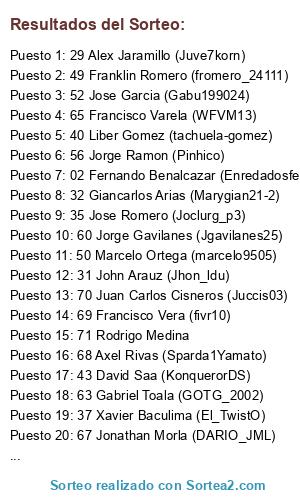 Lista de participantes: 37 Xavier Baculima (El_TwistO), 43 David Saa (KonquerorDS), 32 Giancarlos Arias (Marygian21-2), 52 Jose Garcia (Gabu199024), 56 Jorge Ramon (Pinhico), 60 Jorge Gavilanes (Jgavilanes25), 02 Fernando Benalcazar (Enredadosfer), 40 Liber Gomez (tachuela-gomez), 50 Marcelo Ortega (marcelo9505), 63 Gabriel Toala (GOTG_2002), 65 Francisco Varela (WFVM13), 67 Jonathan Morla (DARIO_JML), 35 Jose Romero (Joclurg_p3), 29 Alex Jaramillo (Juve7korn), 31 John Arauz (Jhon_ldu), 68 Axel Rivas (Sparda1Yamato), 69 Francisco Vera (fivr10), 28 Roberto Lainez (Primex79), 57 Jack (Jack_Lenoroc), 70 Juan Carlos Cisneros (Juccis03), 49 Franklin Romero (fromero_24111), 71 Rodrigo Medina.