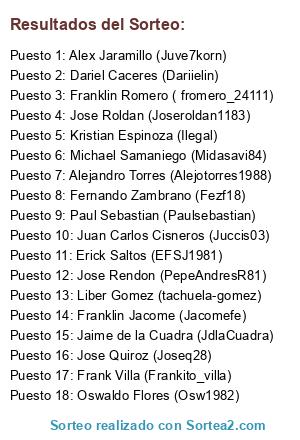 Lista de participantes: Jose Rendon (PepeAndresR81), Michael Samaniego (Midasavi84), Kristian Espinoza (Ilegal), Paul Sebastian (Paulsebastian), Alex Jaramillo (Juve7korn), Fernando Zambrano (Fezf18), Alejandro Torres (Alejotorres1988), Franklin Romero ( fromero_24111), Jose Roldan (Joseroldan1183), Erick Saltos (EFSJ1981), Frank Villa (Frankito_villa), Juan Carlos Cisneros (Juccis03), Franklin Jacome (Jacomefe), Liber Gomez (tachuela-gomez), Oswaldo Flores (Osw1982), Dariel Caceres (Dariielin), Jaime de la Cuadra (JdlaCuadra), Jose Quiroz (Joseq28).