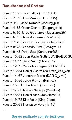 Lista de participantes: 43 David Saa (KonquerorDS), 52 Jose Garcia (Gabu199024), 56 Jorge Ramon (Pinhico), 60 Jorge Gavilanes (Jgavilanes25), 67 Jonathan Morla (DARIO_JML), 28 Roberto Lainez (Primex79), 49 Franklin Romero (fromero_24111), 48 Erick Saltos (EFSJ1981), 72 Yader Nicaragua (YEFREN9), 74 Victor Alonzo (Valonzobsc), 75 Kike Veliz (Kike12bsc), 76 Byron Gavilanes (Paquirri89), 78 Leonardo Silva (Leo4gzs86), 80 Marlon Naranjo (Maralcis), 39 Omar Zurita (Kikez-USA), 45 Oswaldo Flores (Osw1982), 35 Jose Romero (Joclurg_p3), 81 Daniel Arce (danielarce79), 82 Juan Pablo Gutti (JUANPABLOGUTI11), 73 Guillermo Drouet (DrouetBSC), 25 Sebastian Ñauta (Sebasnauta), 31 John Arauz (Jhon_ldu), 40 Liber Gomez (tachuela-gomez), 15 Jonathan Samaniego (Zocosama), 11 Dario Veliz (Clasico_1), 69 Francisco Vera (fivr10), 84 Daniel Castro (da9-fran_cas_vel), 85 Oscar Gomez (Dragon_d--b), 86 Alex Castro (alexcastro19).