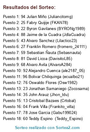 Lista de participantes: 05 Marlon Lopez (Marlinipe95), 06 Gabriel Toala (GOTG_1802), 41 Roy Franco (roy_steven_jklm), 03 Diego Garcia (Messsii10), 55 Jose Ramirez (Ecuador1Jose), 71 Carlos Arana (Carlos11Arana), 01 Dariel Caceres (Dariielin), 77 Sergio Ortega (Fifa17znt2), 34 Juan Manuel Zurita (Juanmzs1992), 38 Javi Pando (JaviPando9679), 19 Jorge Chaguay (Jdch20), 51 Jose Daniel (Josedaniel11306), 39 Javier Sosa (Jsosa_03), 36 Carlos Luis Caceres (Caceres-beecu), 50 Israel Alvarez (Israelalvarexz9), 74 Jose Bermeo (Sebucho2003), 53 Julio Franco (jcfrancomogro), 10 Juan Carlos Cisneros (Juccis03).