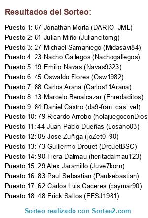 Lista de participantes: 49 Franklin Romero (fromero_24111), 25 Sebastian Ñauta (Sebasnauta), 74 Victor Alonzo (Valonzobsc), 43 David Saa (KonquerorDS), 76 Byron Gavilanes (BYRONg1989), 81 Daniel Arce (danielarce79), 32 Giancarlos Arias (Marygian21-2), 07 Pepe Lopez (PpLopezV), 08 Julio Franco (jcfrancomogro), 65 Francisco Varela (WFVM13), 28 Roberto Lainez (Primex79), 75 Kike Veliz (Kike12bsc), 11 Dario Veliz (Clasico_1), 60 Jorge Gavilanes (Jgavilanes25), 91 Jonathan Vite (Jdvite06), 92 Hector Benitez (hector121090), 94 Andres Pineida (Elpipe3011), 95 Israel Alvarez (Israelalvarexz9).