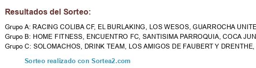Lista de participantes: ENCUENTRO FC, RACING COLIBA CF, LOS WESOS, BAR EMBRUJA2, GUARROCHA UNITED, SOLOMACHOS, SANTISIMA PARROQUIA, LOS AMIGOS DE FAUBERT Y DRENTHE, COCA JUNIORS HD, EL BURLAKING, HOME FITNESS, DRINK TEAM.