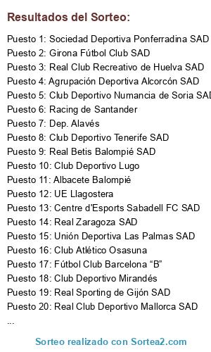 Lista de participantes: Fútbol Club Barcelona “B”, Real Betis Balompié SAD, Real Club Deportivo Mallorca SAD, Club Atlético Osasuna, Real Zaragoza SAD, Real Valladolid Club de Fútbol SAD, Racing de Santander, Unión Deportiva Las Palmas SAD, Club Deportivo Tenerife SAD, Real Sporting de Gijón SAD, Girona Fútbol Club SAD, Sociedad Deportiva Ponferradina SAD, Club Deportivo Lugo, Real Club Recreativo de Huelva SAD, Dep. Alavés, Centre d'Esports Sabadell FC SAD, Albacete Balompié, Club Deportivo Numancia de Soria SAD, Club Deportivo Mirandés, Agrupación Deportiva Alcorcón SAD, CD Leganés, UE Llagostera.