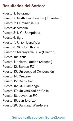 Lista de participantes: boca, river, san lorenzo, racing, velez, estudiantes, gimnasia, tigre, lanus, belgrano, North London (Arsenal), West Midlands Village (Aston Villa), London FC (Chelsea), Merseyside Blue (Everton), West London White (Fulham), Merseyside Red (Liverpool), Man Blue (Manchester City, Tyneside (Newcastle United), manchester united, North East London (Tottenham), FC Barcelona, Real Madrid, Atlético Madrid, Real Betis, Sevilla FC, Valencia, Almeria, Real Sociedad, Athletic Bilbao, Espanyol, Calcio Catania, ACF Fiorentina, Inter, Juventus F.C., S.S. Lazio, A.C. Milan, S.S.C. Napoli, Parma F.C., A.S. Roma, U.C. Sampdoria, Botafogo, SC Corinthians, Cruzeiro, CR Flamengo, Fluminense FC, Grêmio, SC Internacional, Santos FC, São Paulo, Vasco da Gama, Audax Italiano, Cobreloa, Cobresal, Colo-Colo, C.S.D. Rangers, Santiago Wanderers, Unión Española, Universidad Católica, Universidad de Chile, Universidad Concepción.