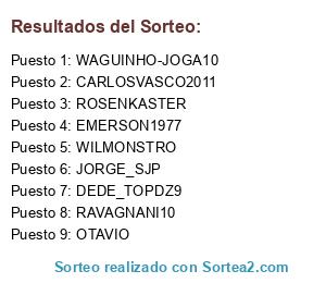 Lista de participantes: WILMONSTRO, RAVAGNANI10, WAGUINHO-JOGA10, ROSENKASTER, DEDE_TOPDZ9, EMERSON1977, CARLOSVASCO2011, OTAVIO, JORGE_SJP.