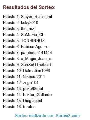 Lista de participantes: fbn_mz , zega104, poku98real, SaMaFia_CL, hektor_Gallardo, terabin, XunXoOThebesT, koky3010, FabiaanAguirre, Dalmation1096, pataboom141414, Slayer_Rules_lml, x_Magic_Juan_x, TONHINHOZ, Nikocra2011, Dieguigool.