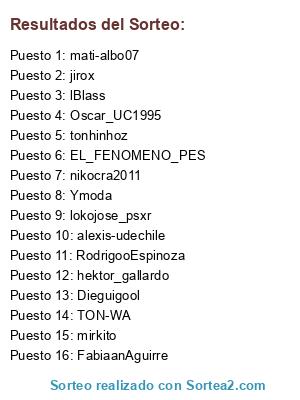 Lista de participantes: mirkito, RodrigooEspinoza, TON-WA, nikocra2011, tonhinhoz, Ymoda, hektor_gallardo, mati-albo07, lokojose_psxr, Oscar_UC1995, alexis-udechile, Dieguigool, lBlass, jirox, EL_FENOMENO_PES, FabiaanAguirre.