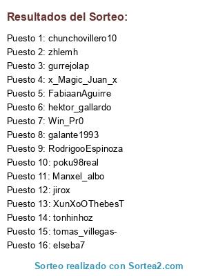 Lista de participantes: chunchovillero10, hektor_gallardo, zhlemh, galante1993, gurrejolap, Win_Pr0, Manxel_albo, tomas_villegas-, tonhinhoz, FabiaanAguirre, jirox, poku98real, XunXoOThebesT, RodrigooEspinoza, x_Magic_Juan_x, elseba7.