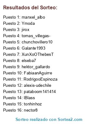 Lista de participantes: XunXoOThebesT, hektor_gallardo, chunchovillero10, FabiaanAguirre, elseba7, tomas_villegas-, manxel_albo, Ymoda, pataboom141414, alexis-udechile, lBlass, jirox, nector8, RodrigooEspinoza, Galante1993 , tonhinhoz.