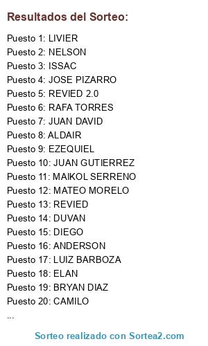 Lista de participantes: DIEGO, ANDERSON, ALDAIR, DUVAN, JUAN DAVID, ATENEXIA, ISSAC, RAFA TORRES, BRYAN DIAZ, ALAVARO G, REVIED, REVIED 2.0, ELAN, NELSON, MATEO MORELO, JUAN GUTIERREZ, LIVIER, MAIKOL SERRENO, LUIZ BARBOZA, EZEQUIEL, CAMILO, JOSE PIZARRO.