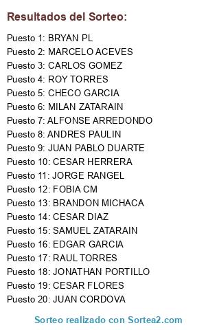 Lista de participantes: Aidanthebest7, Androide1014, Alexsanfer11, Carlotess90, CrisGijon_Leon_2, DiSolano26, Heti_69, Jvlm-12, Micro-RS793, Pixu-XIII, Slc-10, Sogga-, Xoxebetico.