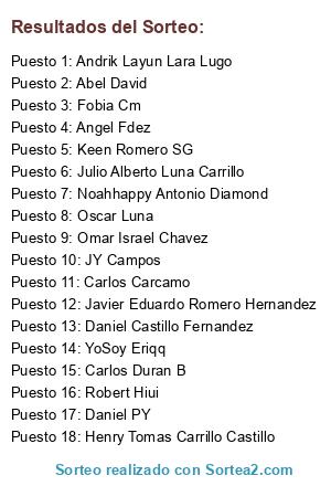 Lista de participantes: Robert Hiui, Keen Romero SG, Daniel Castillo Fernandez, Omar Israel Chavez, Fobia Cm, Abel David, Andrik Layun Lara Lugo, YoSoy Eriqq, Oscar Luna, Javier Eduardo Romero Hernandez, Carlos Duran B, Henry Tomas Carrillo Castillo, Daniel PY, Carlos Carcamo, Noahhappy Antonio Diamond, JY Campos, Julio Alberto Luna Carrillo, Angel Fdez.