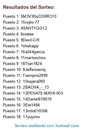 Lista de participantes: 1shakajpp, 2BACHA_-_13, 3Ete1484, 4SANTYQG12, 5M3V3NyCORR310, 6otates, 7vampire2999, 8Jefferssonq, 9Devil-Cr9, 10najera090, 11martonchos, 12PENATE-MAYA-503, 13milo010306, 14Daniel619619, 15rojito-77, 16a544garcia, 17yuyimo, 18Ttan1824.