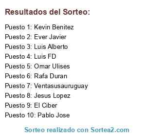 Lista de participantes: Kevin Benitez, Luis FD, Rafa Duran, Ventasusauruguay, Luis Alberto, Jesus Lopez, Pablo Jose, Ever Javier, Omar Ulises, El Ciber.