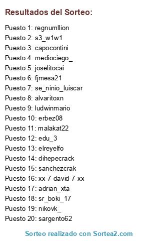 Lista de participantes: mediociego_, capocontini, regnumllion, sanchezcrak, xx-7-david-7-xx, erbez08, nikovk_, se_ninio_luiscar, adrian_xta, s3_w1w1, joselitocai, elreyelfo, malakat22, fjmesa21, dihepecrack, alvaritoxn, edu_3, ludwinmario, sr_boki_17, sargento62.