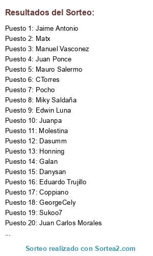 Lista de participantes: GAVILANES, E. NAVAS, MARTIN, ACHE, POCHO, TORRES, EL10DE100PRE, JAVI SOSA, OSWALDO, DASAM-BATALLAS, ORACLE, COPPIANO, ZISU, JHON, ARAUZ, CELI, PPLOPEZ, HONNING.
