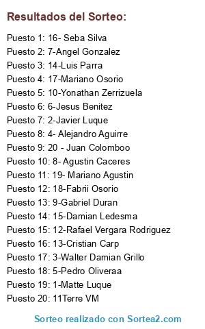 Lista de participantes: 1-Matte Luque, 2-Javier Luque, 3-Walter Damian Grillo, 4- Alejandro Aguirre, 5-Pedro Oliveraa, 6-Jesus Benitez, 7-Angel Gonzalez, 8- Agustin Caceres, 9-Gabriel Duran, 10-Yonathan Zerrizuela, 11Terre VM, 12-Rafael Vergara Rodriguez, 13-Cristian Carp, 14-Luis Parra, 15-Damian Ledesma, 16- Seba Silva, 17-Mariano Osorio, 18-Fabrii Osorio, 19- Mariano Agustin, 20 - Juan Colomboo.