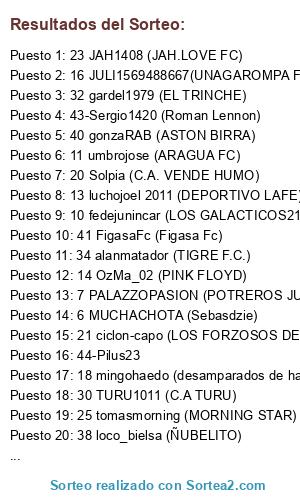 Lista de participantes: 2 FUTURO (Palo30mino), 5 MATADOR (Diegotigre), 6 MUCHACHOTA (Sebasdzie), 7 PALAZZOPASION (POTREROS JUNIORS), 8 RIVERPOOL(Lvr2009), 9 Pablo_cja (Centro juventud antoniana), 10 fedejunincar (LOS GALACTICOS21), 11 umbrojose (ARAGUA FC), 12 caste_cda ( BAYERN ARGENTINO (R)), 13 luchojoel 2011 (DEPORTIVO LAFE), 14 OzMa_02 (PINK FLOYD), 15 Sante_09 (Patricio Rey), 16 JULI1569488667(UNAGAROMPA F.C), 17 Palazzoargento (Raspa Que te Raspa ), 18 mingohaedo (desamparados de haedo), 19 PalazzoPachu (F.C 14MILLONES), 20 Solpia (C.A. VENDE HUMO), 21 ciclon-capo (LOS FORZOSOS DE ), 22 CAMyF (C.A. MY FRIEND), 23 JAH1408 (JAH.LOVE FC), 25 tomasmorning (MORNING STAR), 26 TrocheMoche- (MARICONCHITAS), 27 GEMZ- (REAL ALBAÑIL), 28 Hernan1973 (C.A. LEPROSOS), 29 Lucho_calidad (1° DE MAYO), 30 TURU1011 (C.A TURU), 31 leobonatti1976 DEPUTAS F.C., 32 gardel1979 (EL TRINCHE), 33 rdiavolo (DIAVOLO F.C.), 34 alanmatador (TIGRE F.C.), 35 juanmatrepat (NATALIA-NATALIA), 36 gustachenge11(ATLETICO NACIONAL), 37 el corcho (DEFENSOR SPORTING), 38 loco_bielsa (ÑUBELITO), 39 eleeze87 (MAGIA RUSTICA), 40 gonzaRAB (ASTON BIRRA), 41 FigasaFc (Figasa Fc), 42- Tiito_Lp ( VALENCIANNES FC), 43-Sergio1420 (Roman Lennon), 44-Pilus23.