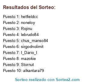 Lista de participantes: sirgodnolimit, I_Dario_I, lebrudo84, chus_manso84, hetfieldcc, Rojinu, Stornut, alkantara79, mazokie, noneloy.