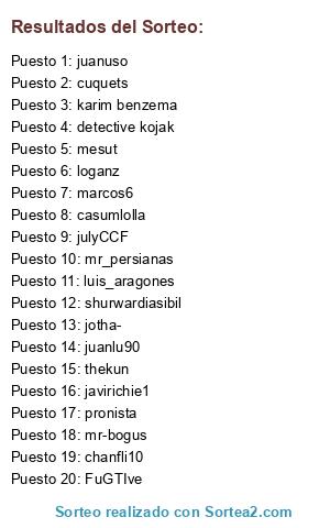 Lista de participantes: pronista, chanfli10, juanuso, juanlu90, FuGTIve, javirichie1, mr-bogus, mesut, luis_aragones, jotha-, detective kojak, casumlolla, mr_persianas, julyCCF, marcos6, loganz, karim benzema, thekun, cuquets, shurwardiasibil.
