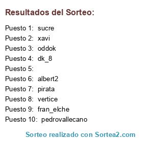 Lista de participantes: sucre, a69tepongo, , pedrovallecano, xavi, albert2, oddok, vertice, dk_8, pirata, fran_elche.