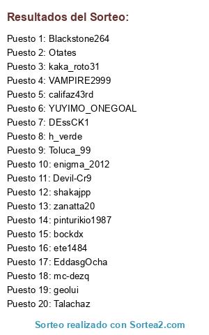 Lista de participantes: VAMPIRE2999, ete1484, h_verde, enigma_2012, mc-dezq, DEssCK1, Otates, califaz43rd, shakajpp, geolui, YUYIMO_ONEGOAL, EddasgOcha, kaka_roto31, Blackstone264, bockdx, Devil-Cr9, Talachaz, Toluca_99, pinturikio1987, zanatta20.