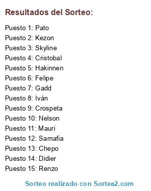 Lista de participantes: Renzo, Felipe, Crospeta, Cristobal, Pato, Chepo, Gadd, Samafia, Mauri, Skyline, Didier, Hakinnen, Kezon, Iván, Nelson.
