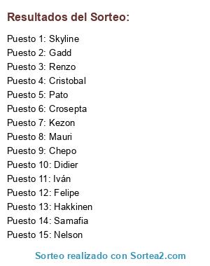 Lista de participantes: Kezon, Samafia, Mauri, Skyline, Didier, Chepo, Iván, Pato, Gadd, Renzo, Cristobal, Nelson, Hakkinen, Felipe, Crosepta.