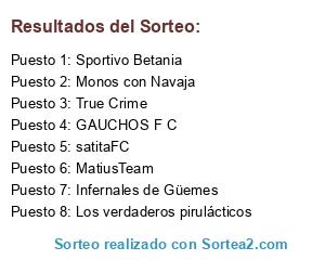 Lista de participantes: GAUCHOS F C, Monos con Navaja, True Crime, Sportivo Betania, MatiusTeam, satitaFC, Infernales de Güemes, Los verdaderos pirulácticos.