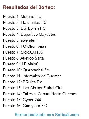Lista de participantes: J.P Maipú, BRujita F.c, Infernales de Güemes, Talleres Central Norte Guemes, Cyber 244, Flatulentos FC, Dor Lómin FC, Deportivo Mayuatos, Los Albitos Fútbol Club, Moreno.F.C, swenden, FC Chompiras, Atlético Salta, SigloXXI F.C, Quebrachal f.c., Gim y tiro F.C.