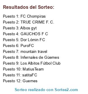 Lista de participantes: PuroFC, Dor Lómin FC, Infernales de Güemes, Guemes, Los Albitos Fútbol Club, GAUCHOS F C, TRUE CRIME F. C., satitaFC, FC Chompiras, mountain travel, Albos gyt, MatiusTeam.