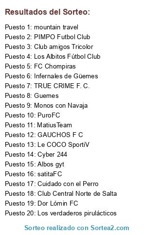 Lista de participantes: TRUE CRIME F. C., Club Central Norte de Salta, Cuidado con el Perro, Cyber 244, Infernales de Güemes, Le COCO SportiV, mountain travel, FC Chompiras, PuroFC, Los verdaderos pirulácticos, Dor Lómin FC, Club amigos Tricolor, Monos con Navaja, Albos gyt, MatiusTeam, satitaFC, Guemes, PIMPO Futbol Club, Los Albitos Fútbol Club, GAUCHOS F C.